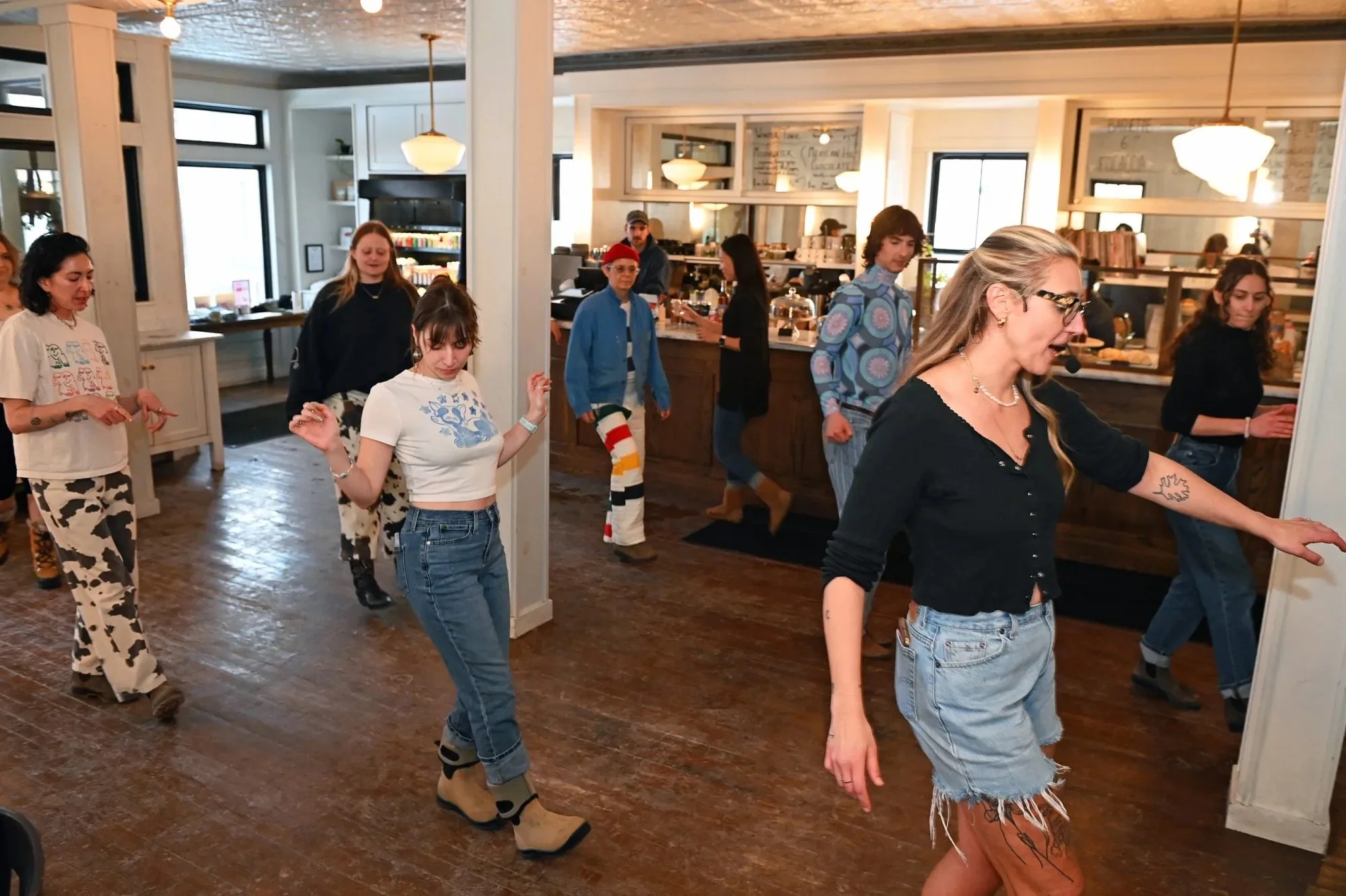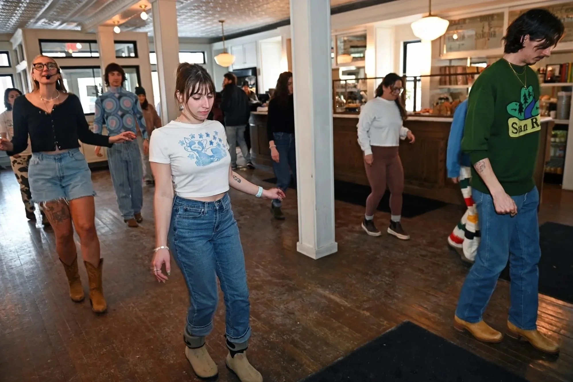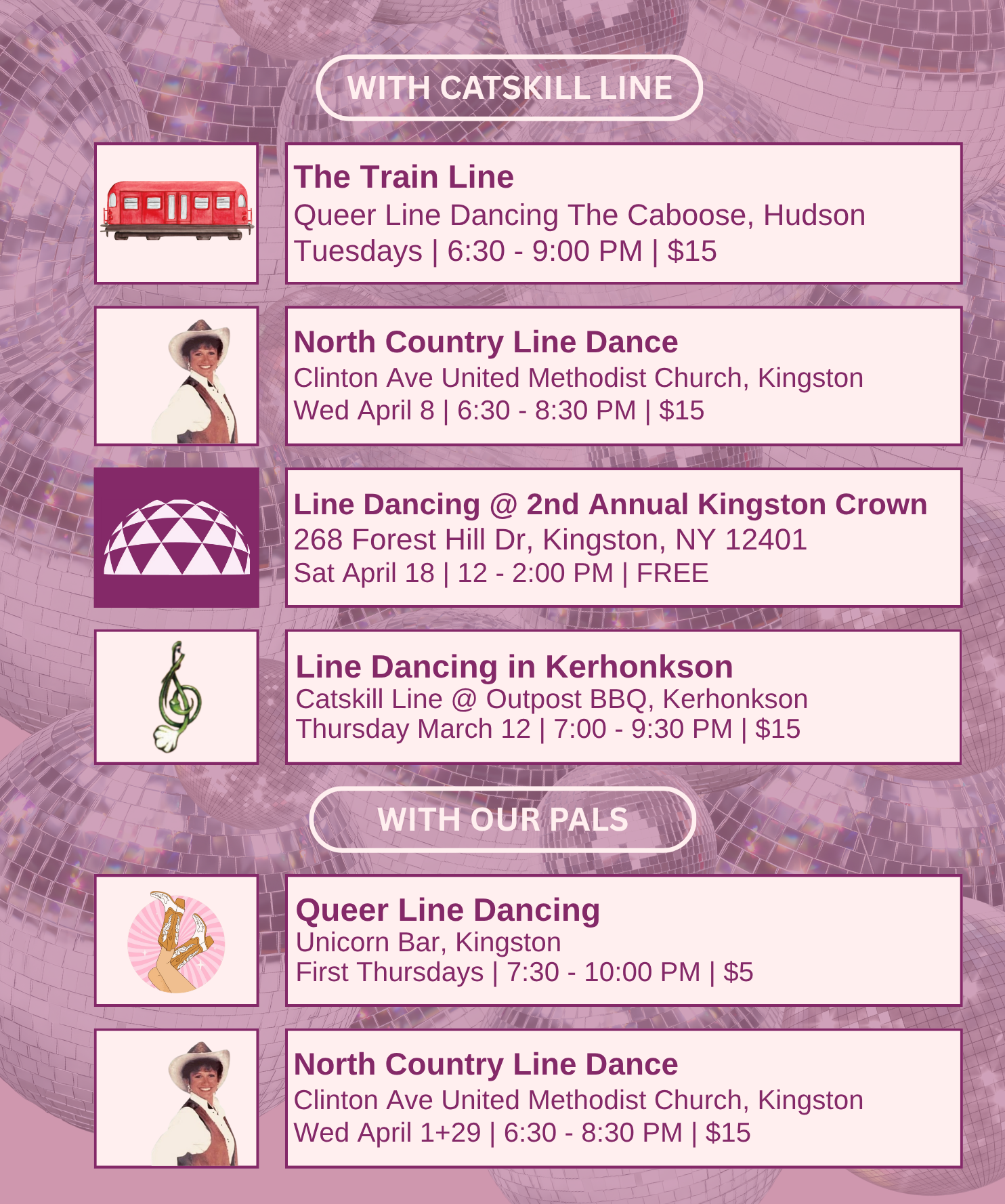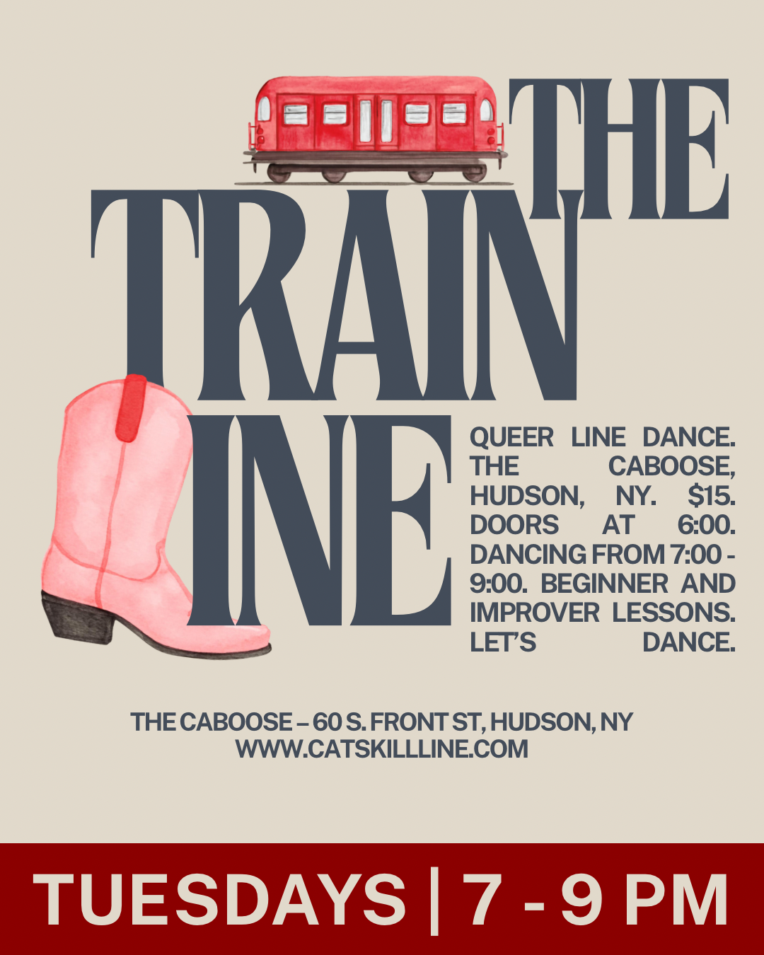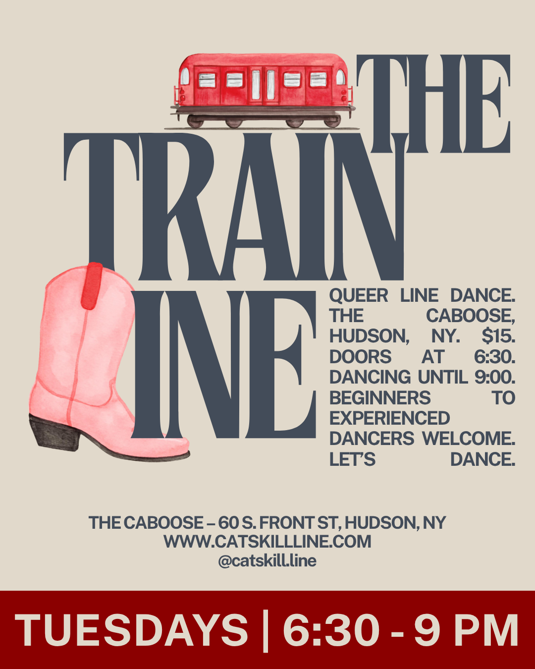 Now I teach in the Hudson Valley! You can find me hosting AvaLine at the Avalon Lounge in Catskill, hosting The Train Line at The Caboose in Hudson, subbing at Unicorn Bar’s Queer Line Dance, and previously teaching Lava Line, a beginner’s class with Lava Hot Yoga in Catskill. I love collaborating with local venues and line and two-step teachers to create welcoming, beginner-friendly events because, honestly, I want more chances to dance close to home and to build our dance community. No experience or partner needed. Just show up ready to move and have fun!