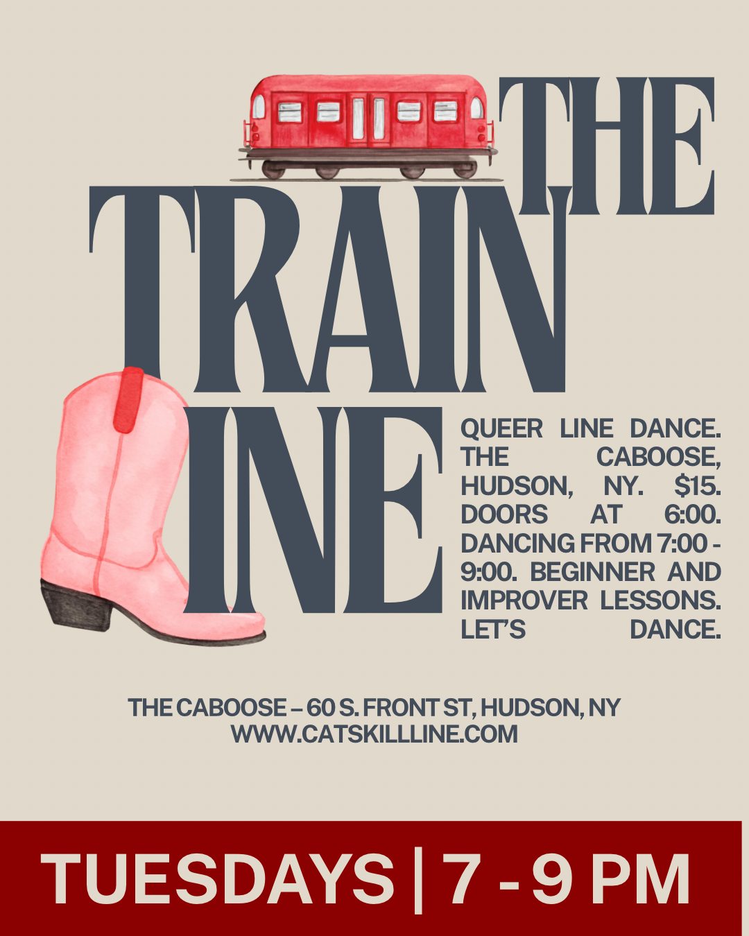 Now I teach in the Hudson Valley! You can find me hosting AvaLine at the Avalon Lounge in Catskill, hosting The Train Line at The Caboose in Hudson, subbing at Unicorn Bar’s Queer Line Dance, and previously teaching Lava Line, a beginner’s class with Lava Hot Yoga in Catskill. I love collaborating with local venues and line and two-step teachers to create welcoming, beginner-friendly events because, honestly, I want more chances to dance close to home and to build our dance community. No experience or partner needed. Just show up ready to move and have fun!